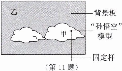 11. (2023·宁波)如图所示为模拟孙悟空“腾云驾雾”的拍摄装置,该装置主要由“孙悟空”模型(以点代替)和“蓝天白云”背景板组成。为了让孙悟空从背景板的甲处移到乙处,一般有两种方式:第一种是背景板相对于地面静止,移动孙悟空;第二种方式是孙悟空相对于地面静止,移动背景板。如果采用第二种方式,那么背景板按下列方向移动可以实现的是( )