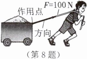8.(2023·随州)如图所示,小强用100 N的力斜向上拉着总重为500 N的小车,使小车在水平路面上匀速直线前进了10 m,用了10 s。下列说法中,正确的是( )