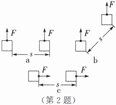 2. 如图所示,在a、b、c三种情况下,用大小相同的力F使同一物体沿不同的轨迹移动了相同的距离s,三种情况下拉力F所做的功分别为$W_{a}$、$W_{b}$、$W_{c}$,则下列判断中,正确的是( )