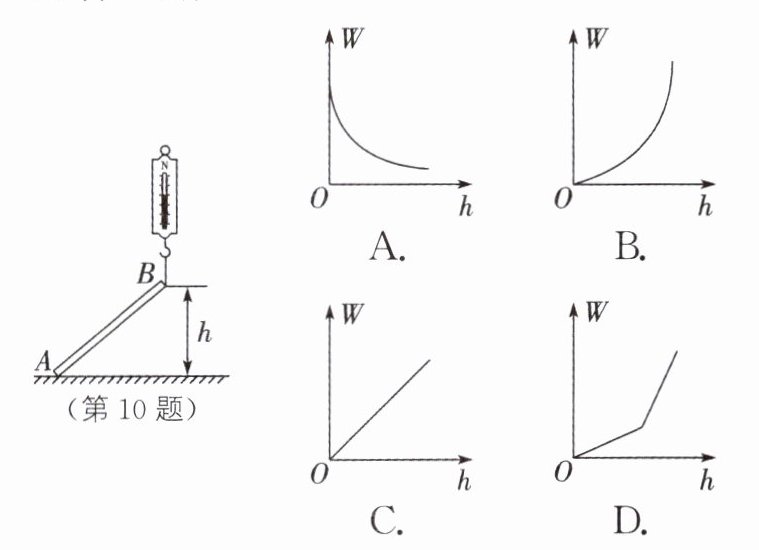 10. 一根匀质实心金属棒AB置于水平地面上,用弹簧测力计始终沿竖直方向拉棒的B端,将其缓慢匀速拉离地面,如图所示。在此过程中,关于弹簧测力计对棒所做的功W与B端离开地面的高度h的关系,下列选项中最合理的是( )