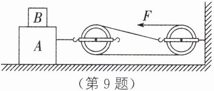9.(2024·达州)如图所示,A、B两物体叠放在水平桌面上,$G_A= 80N$,$G_B= 20N$,A、B均为正方体,棱长分别为20cm、10cm。在拉力F= 30N的作用下,5s内,物体A、B一起向右匀速直线移动了3m。若不计滑轮和绳自重及绳与滑轮间的摩擦,下列说法中,错误的是( )