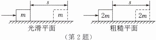 2.(2024·连云港)如图所示,一个人先后两次用同样的时间、同样大小的力,使不同质量的物体在不同的表面上分别移动相同的距离。该力在此过程中所做功的大小分别为$W_1$、$W_2$,功率的大小分别为$P_1$、$P_2$,关于它们之间的大小关系,下列说法中正确的是( )