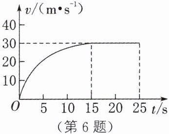 6. 一辆轿车以$9×10^6W$的恒定功率启动并做直线运动,共运动了25s,已知前15s内行驶了总路程的一半,运动的速度v与时间t的关系如图所示,由此可知前15s内轿车运动的距离是______m,20~25s内轿车受到的阻力为______N,前15s内轿车牵引力所做的功是______J。
