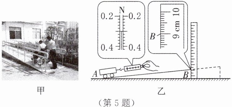 5. 易错题 如图甲所示,某居民楼前有无障碍通道,一名中年人正用轮椅推着他的父亲缓缓上行,如图乙所示为该通道斜面示意图。为了解中年人推轮椅时所用力的大小,小红和小华进行了探究。她们沿斜面确定了与斜面底端 A 点相距 1 m 的 B 点。(g 取 10 N/kg)