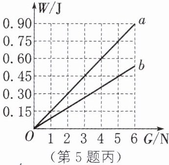 (3) 在小车上逐渐添加重物,测出小车和重物的总重 G 和沿斜面匀速拉动小车需要的力,计算出拉着小车从 A 点到 B 点所做的功$ W_1;$计算出将小车从水平地面竖直向上提升到 B 点所做的功$ W_2。$以功为纵坐标,以小车和重物的总重为横坐标,建立平面直角坐标系,作出$ W_1 $和$ W_2 $与小车和重物的总重 G 的关系图像,分别如图丙中的图线 a 和 b 所示。