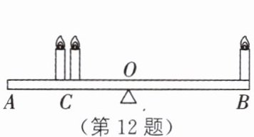 12. 如图所示为粗细均匀的轻质杠杆AB,将中点O支起来,在B端放一支蜡烛,在AO的中点C放两支与B端蜡烛完全相同的蜡烛,如果将三支蜡烛同时点燃,它们的燃烧速度相同。那么在蜡烛的燃烧过程中,杠杆AB将( )