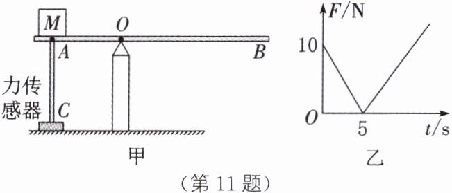 11. 如图甲所示,AB为轻质杠杆,AC为轻质硬棒且与力传感器相连,图乙是物体M从A点开始向右匀速运动的过程中,力传感器读数大小与时间的关系图像,则物体M的质量大小是______g;已知OA的长度为30 cm,OB足够长,AC能承受的最大弹力大小为15 N,若要杠杆不断,则物体从A点开始运动的时间最长为______s。(g取10 N/kg)
