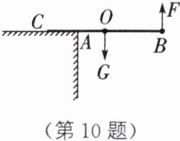 10. 如图所示,有一根均匀的直铁棒BC长为L、重为420 N,左端放在水平桌面上,A为桌角的位置,$AC= \frac{2}{9}L$,为了使铁棒保持水平,B端所需竖直向上的拉力F至少为______N;若F的方向保持不变,则能使铁棒保持水平的拉力F的范围是______N。