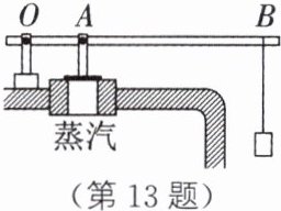 13. (2023·常德)如图所示为锅炉保险阀门的示意图。当阀门受到的蒸汽压力超过其安全值时,阀门就会被拉开。若$OB= 2\ m$,$OA= 0.5\ m$,阀门的底面积$S= 2\ cm^2$,锅炉内气体压强的安全值$p= 6×10^{5}\ Pa$(杠杆的重力、摩擦均不计,大气压强$p_{0}= 1×10^{5}\ Pa$),则B端所挂重物的重力是( )