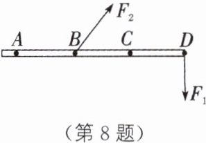 8. 如图所示,一轻质硬棒在$F_{1}$、$F_{2}$两个力的作用下处于静止状态,则硬棒的支点可能在杠杆的( )