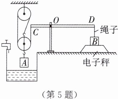 5. 如图所示为利用电子秤监控水库水位的装置,由长方体A和B、滑轮组、轻质杠杆CD、电子秤等组成,杠杆 答案讲解 始终在水平位置平衡。已知$OC:OD= 1:2$,A的体积为0.02 m^3,A的重力为400 N,B的重力为150 N,动滑轮重为100 N,不计绳重与一切摩擦,$\rho_水= 1.0×10^3\ kg/m^3$,g取10 N/kg。求: