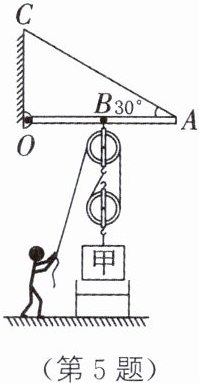 5.(2024·达州)如图所示,有一重为200N、底面积为$0.4m^{2}$的方形玻璃缸(玻璃缸壁的厚度忽略不计),玻璃缸中装有重为1000N的水,上方有一轻质杆OA,在绳子AC的拉力作用下可绕竖直墙上O点转动。现在OA的中点B处悬挂一滑轮组,已知每个滑轮重为20N,滑轮组上悬挂着重为300N的重物甲,将浸没的重物甲缓慢拉离水面后,玻璃缸中水位下降了5cm,求:(忽略重物带出的水,$\rho_{水}= 1×10^{3}kg/m^{3}$,g取10N/kg)