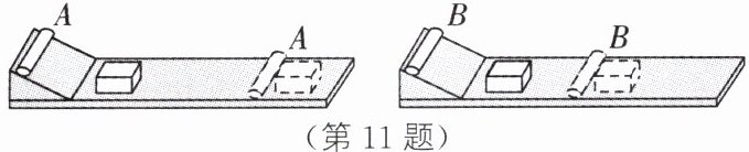 11. 如图所示,小华将外形相同的实心铝、铜圆柱($\rho_{铜}>\rho_{铝}$)都涂成白色,随机标记为A、B。将A、B分别从同一斜面的相同高度由静止释放,撞击静止在同一水平面上、处于相同位置的同一纸盒,发现A将纸盒撞得更远。这说明滚到斜面底端时,______的动能大,______是铝制的。(A/B)