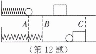 12. 为了探究“弹性势能的大小与物体的弹性形变大小的关系”,小明用如图所示的装置进行实验,B处为弹簧的原长位置。在水平桌面上,压缩弹簧后将小球由静止释放,使小球撞击同一纸盒,并与纸盒一起向右滑行。撞击前纸盒均位于B点右侧的同一位置。