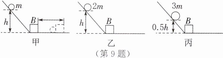 9. ★转换法 如图所示为某学习小组探究“动能大小跟哪些因素有关”的实验操作(图甲、乙、丙中小球的质量分别为$m$、$2m$、$3m$)。