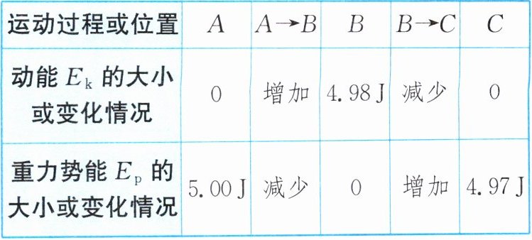 |重力势能$E_{p}$的大小或变化情况|5.00J|减少|0|增加|4.97J|
