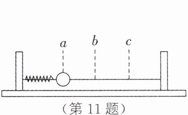 11. 如图所示,弹簧的左端固定,右端连接一个小球,把它们套在光滑的水平杆上,a是压缩弹簧后小球由静止释放的位置,b是弹簧处于原长时小球的位置,c是小球到达最右端时的位置。小球从a运动到c的过程中,在______(a/b/c)位置时机械能最大;从b运动到c的过程中,小球的动能转化为弹簧的______。