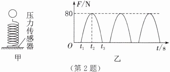 不是 先变大后变小 小于 是 解析:小球从最高点下落到与弹簧刚接触的阶段,重力势能转化为动能,动能增大;由图乙知,$t_{1}$时刻弹力$F=0$,此时小球刚接触弹簧,$t_{2}$时刻弹力$F$达到最大值80N,此时弹簧发生的形变最大,小球到达最低点;$t_{1}\sim t_{2}$时间段内,弹力$F$逐渐增大,在$F$未增大到50N阶段,$G>F$,小球加速向下,小球的动能增大,当$F=50N$时,$F=G$,小球的速度最大,动能最大,此后由于$F>G$,小球减速向下,小球的动能减小,由上述分析可知,$t_{1}$时刻小球的动能不是最大的,小球从最高点到最低点的运动过程中,动能的变化情况是先变大后变小。由图乙知,$t_{3}$时刻弹力$F=0$,此时弹簧刚好恢复原状,$t_{2}\sim t_{3}$时间段内,弹簧的弹性势能转化为小球的动能和重力势能。小球增加的动能小于弹簧减少的弹性势能。由图乙知,小球上下运动的过程中每次弹力达到最大值都相等,说明小球和弹簧总的机械能守恒。