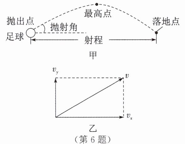 6.体育课上,小明在同一位置用相同的力多次将足球踢出,发现足球斜向上飞出的角度越大,球运动得越高,但并不能运动得越远。小明查阅资料后知道:足球所做的运动叫作斜抛运动,其运动轨迹如图甲所示。足球初始运动方向与水平方向的夹角叫作抛射角,抛出点到落地点的水平距离叫作射程,射程与抛出速度和抛射角的大小有关。若物体的动能大小$E_k= \frac{1}{2}mv^2,$重力势能大小E_p= mgh,不计空气阻力,g取10 N/kg,请回答下列问题: