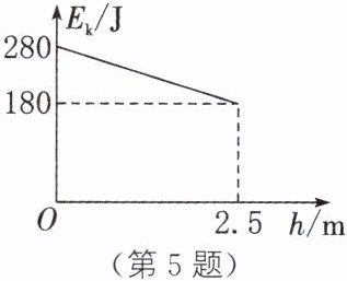 A 解析:由题可知,因为不计空气阻力,机械能守恒,铅球运动过程中只有重力势能和动能的相互转化,若铅球落到地面时重力势能为零,则此时动能取最大值,为280J,此时机械能为280J。由图可知,当铅球到最高点时,即距离地面2.5m时,动能为180J,则重力势能为$E_{p1}=280\ J-180\ J=100\ J=2.5\ m\cdot mg$;已知铅球脱手的高度为2m,所以其重力势能$E_{p2}=2\ m\cdot mg=80\ J$。