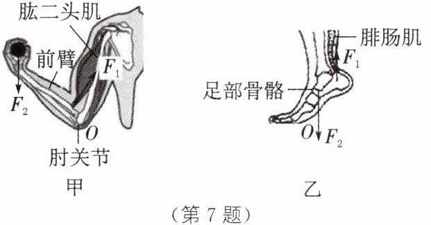 D 解析:手托重物时,动力臂小于阻力臂,可视为费力杠杆,故A错误;根据杠杆五要素可知,手托重物时,肱二头肌对前臂的牵引力是动力,故B错误;踮脚时,动力臂变短,但是动力臂仍然大于阻力臂,可视为省力杠杆,故C错误;根据杠杆五要素可知,在向上踮脚的过程中,腓肠肌对足部骨骼的牵引力是动力,故D正确。