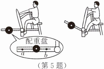 5. 跨学科实践・日常生活(2024·苏州)健身步道上的坐式划船训练器如图所示。人坐在座板上,用始终与把手垂直的力缓慢向后将把手拉至身体两侧,此过程中,拉力大小变化情况是______。若要增加训练强度,应将配重盘向______($ a $/$ b $)端移动。
