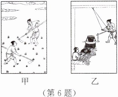 6. 新情境・古代科技 如图所示为《天工开物》中我国古代人民参加劳动的生活场景。图甲为“议耨”的情景,人们使用的工具属于______杠杆;图乙为稻谷加工的部分过程,去壳的“土砻”是一个______杠杆。(省力/费力)
