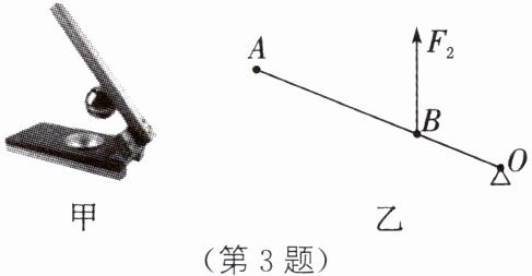 3. 跨学科实践・日常生活(2024·广元)如图甲所示为压饺子皮的“神器”,压饺子皮时压杆可视为一个杠杆,如图乙所示为其简化示意图,图中$ O $为支点,$ F_2 为压饺子皮时作用在 B $点的阻力。请在图乙中画出压饺子皮时作用在$ A 点的最小动力 F_1 及阻力 F_2 的力臂 l_2 $。