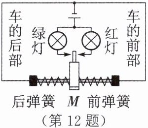 12. 某仪器中的电路如图所示,其中带金属细杆的金属滑块M与两侧金属弹簧相连接并接入电路中,金属滑块M与弹簧套在光滑绝缘水平细杆上。现将该仪器固定在一辆汽车上,当汽车启动时, 亮;当汽车紧急制动时, 亮。(红灯/绿灯)