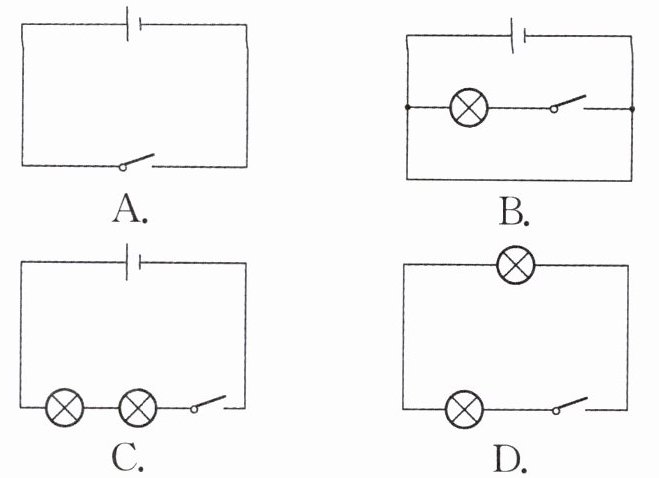 C 解析:一个完整的电路应由电源、用电器、开关和导线组成。A选项中缺少用电器,B选项会造成电源短路,D选项中缺少电源。
