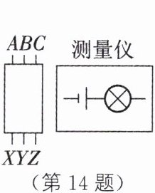 14. 高层建筑的墙体中有三根绞在一起的电线,可以用如图所示的“测量仪”把它们区分开。小华将A、B连在一起时,小明将“测量仪”连接在X、Z两端,灯泡亮;小华将B、C连在一起时,小明将“测量仪”连在X、Y两端,灯泡亮。由此判断( )
