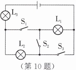 B 解析:当开关S₁、S₂、S₃都闭合时,灯L₂和L₁被短路,只有灯L₃发光;开关S₁、S₂闭合,S₃断开时,灯L₂被短路,L₃和L₁串联发光,只有灯L₂不发光;开关S₃闭合,S₁、S₂断开时,灯L₁断路,L₃和L₂串联发光;开关S₂、S₃闭合,S₁断开时,灯L₁短路,L₃和L₂串联发光。