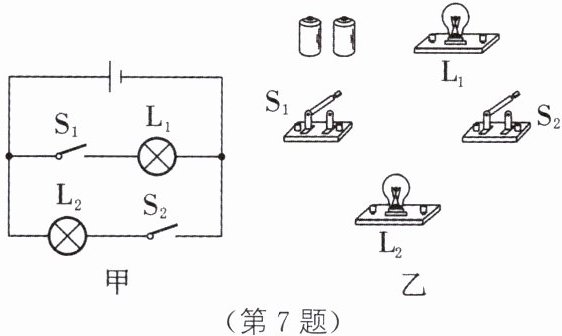 (2)实验时发现:只闭合开关$S_1$时,只有灯$L_1$亮;只闭合开关$S_2$时,只有灯$L_2$亮。这说明:并联电路中,支路上的开关控制______;如果要使一个开关控制两盏灯,开关应接在______。