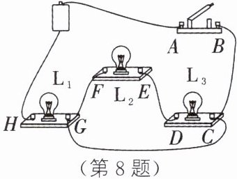 (2)因为电路中B、C、G、F四点可看成一点,所以根据并联电路的定义可知,用导线将E、H或D、H连上,即可使3只小灯泡并联在B、H两点间。