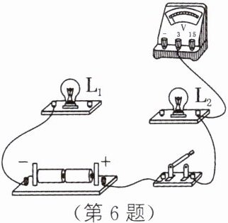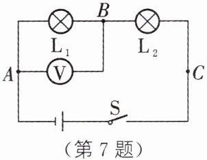 7. 如图所示,灯$L_1$与$L_2$串联在由三节蓄电池组成的电源上,先用电压表测出灯$L_1$两端的电压为2.6 V,则电压表选用的量程是______。测电源电压时,只将电压表接B的一端改接C,这种接法______(正确/不正确),理由是______。