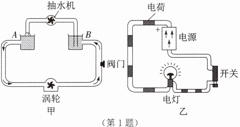 1. 课本中电压概念的引入,采用的是______(控制变量法/等效法/建模法/类比法)。如图甲和乙所示,形象地将水流与______、水压与______、抽水机与______进行类比,得出电压是电路中形成______的原因,______是提供电压的装置。