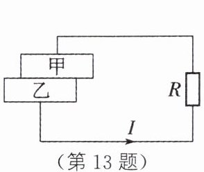 13. 新情境·现代科技 如图所示,甲、乙两种纳米材料相互摩擦后,甲的上表面和乙的下表面分别聚集了不同性质的电荷,将甲、乙接入电路后产生电流,则甲、乙整体上相当于电路中的______(填元件名称);摩擦过程中,甲、乙的机械能转化为______能。