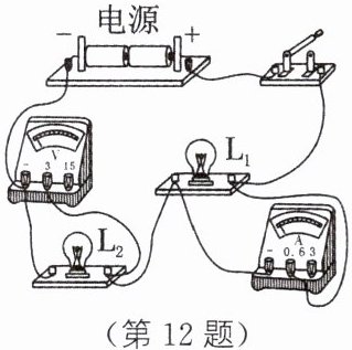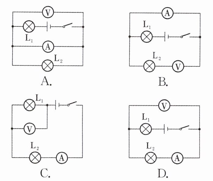 D 解析:图A中,电流表并联到L₂两端,电压表和L₂都被短路,A错误;图B中,电压表与灯L₂串联,电压表的接法错误,B错误;图C中,电压表并联到L₁两端,测量的是L₁两端的电压,C错误;图D中,电压表并联到L₂两端,测量的是L₂两端的电压,电流表串联在电路中,D正确。
