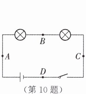 10. 如图所示的电路中,各元件完好,A、B、C、D为接线柱,将电压表接在其中两个接线柱上后,开关闭合时,电压表的示数为0;开关断开时,电压表有示数。与电压表相连的两个接线柱是( )