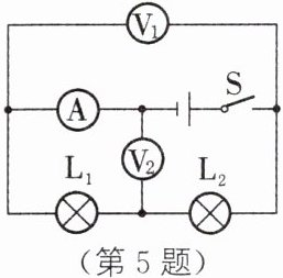 0.2 3 解析:闭合开关S时,两灯串联,V₁测电源电压,V₂测灯L₁两端的电压,通过灯L₁的电流I₁=I=0.2A,电源电压U=5V,灯L₁两端的电压U₁=2V,则灯L₂两端的电压U₂=U-U₁=5V-2V=3V。
