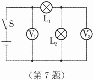 C 解析:由电路图可知,电流从电源正极流出,依次流过开关、灯L₁、灯L₂后流回电源负极,即两灯串联,电压表V₁测电源电压,电压表V₂测灯L₂两端的电压,由串联电路电压规律可知,电压表V₁的示数大于电压表V₂的示数。
