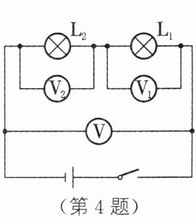 闭合开关后电压表$V_1$的示数为2.5 V,V的示数为4.5 V,则电源电压为______V,灯$L_2$两端的电压为______V。