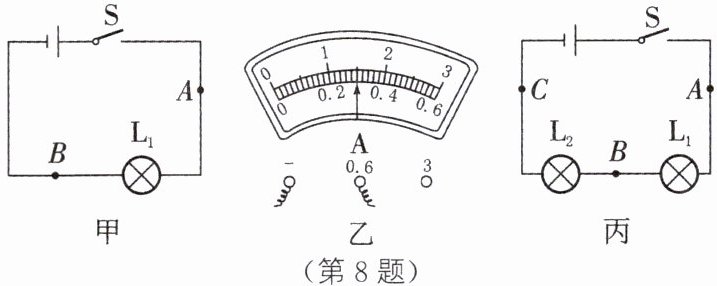 (3)由题图乙可知,电流表量程为0~0.6A,分度值为0.02A,示数为0.3A,即I_A=0.3A;A、B两点电流相等,故猜想是错误的。