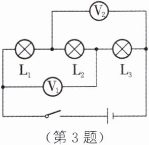 3. (2024·无锡市匡园双语学校期中)如图所示的电路中,闭合开关,电压表$V_1$的示数是7 V,电压表$V_2$的示数为9 V,若$L_3两端的电压是L_1$两端电压的两倍,则电源的电压是( )