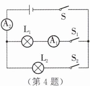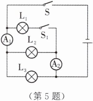 5. 如图所示,开关S、$S_1$都闭合时,电灯$L_1$、$L_2$、$L_3$的连接方式为______,电流表$A_2$测量的是通过______的电流,$A_1和A_2$的指针偏转角度相同,且电流表有两个量程分别为0~0.6 A,0~3 A,此时通过$L_1$、$L_3$的电流之比为1∶8;随后将开关$S_1$断开,发现$A_2$的示数减少了0.2 A,那么开关S、$S_1都闭合时通过L_2$的电流为______A。