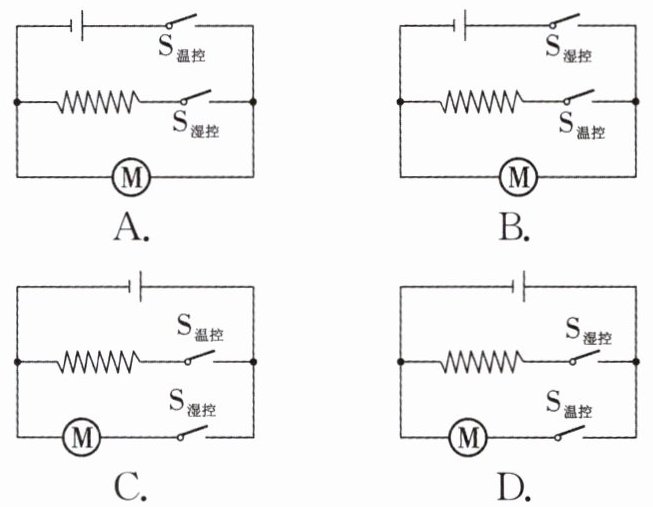 1. (2024·常州)某款电子垃圾桶可以将湿的厨余垃圾变干,作为动物饲料。将湿的厨余垃圾倒入垃圾桶,电路检测到桶内垃圾是湿的时,就开始吹风。在吹风过程中:当桶内温度低时,吹热风;当桶内温度高时,吹冷风……直至垃圾变干。之后,整个电路结束工作。开关$S_{湿控}$在垃圾湿时闭合、干时断开;开关$S_{温控}$在桶内温度低(≤60 ℃)时闭合、温度高(>60 ℃)时断开。下列电路中,符合要求的是( )