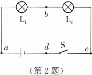 2. (2023·鄂州)如图所示,开关S闭合时,小灯泡$L_1$、$L_2$都不亮,用一段导线的两端接触a、b两点时两小灯泡都不亮;接触b、c两点时,两小灯泡也不亮;接触c、d两点时,两小灯泡都亮。对此,下列判断中可能正确的是( )