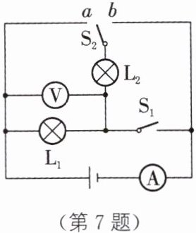 7. 如图所示,当开关$S_1$闭合,$S_2$接a时,电压表示数为2.8 V,电流表示数为2 A;当开关$S_1$断开,$S_2$接b时,电压表示数为2 V,电流表示数为1 A,则此时$L_2$两端的电压是______V;当开关$S_1$闭合,$S_2$接b时,通过$L_1$的电流______(大于/等于/小于)2 A。
