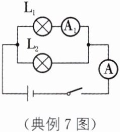 典例7 如图所示,电源电压为3 V,开关闭合后,电流表A的示数为0.3 A,电流表$A_1$的示数为0.2 A。灯泡$L_1$、$L_2$的连接方式为______联,灯泡$L_1$两端的电压为______V,通过灯泡$L_2$的电流为______A。