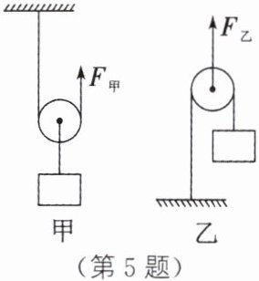 5.D 解析:图甲是动滑轮,动滑轮不能改变力的方向,但是可以省一半的力,所以$F_{甲}=\frac{1}{2}G_{物}=\frac{1}{2}×200\,N=100\,N$,拉力端移动的距离$s=2h=2×2\,m=4\,m$,故A、B错误;图乙是动滑轮,由图可知,$G_{物}=\frac{1}{2}F_{乙}=200\,N$,所以$F_{乙}=400\,N$,拉力端移动的距离$s'=\frac{1}{2}h=\frac{1}{2}×2\,m=1\,m$,故C错误,D正确。